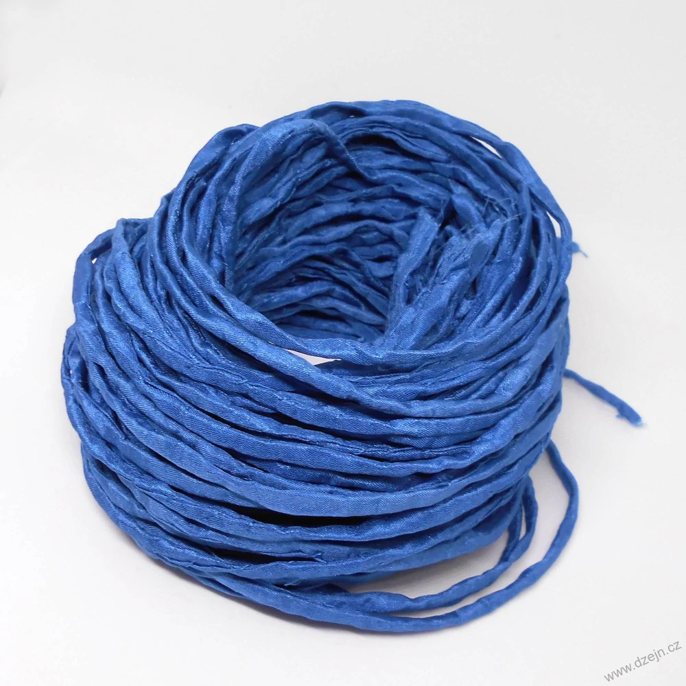 Hedvábná šňůrka z pravého přírodního hedvábí pongé 5 je ručně barvená safírově modrou barvou (jedná se o tmavě modrou barvu). Délka šňůrky je 105-110 cm, průměr cca 2 mm. Šňůrka je plochá a lze ji protáhnou i dírkou o průměru 1 mm.