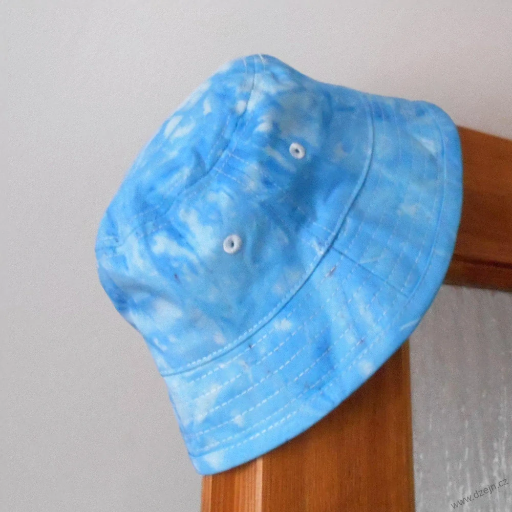Světle modrý dětský klobouček z organické bavlny je batikovaný modrou až tyrkysovou barvou, po obvodu jsou čtyři větrací otvory obšité bílou nití.