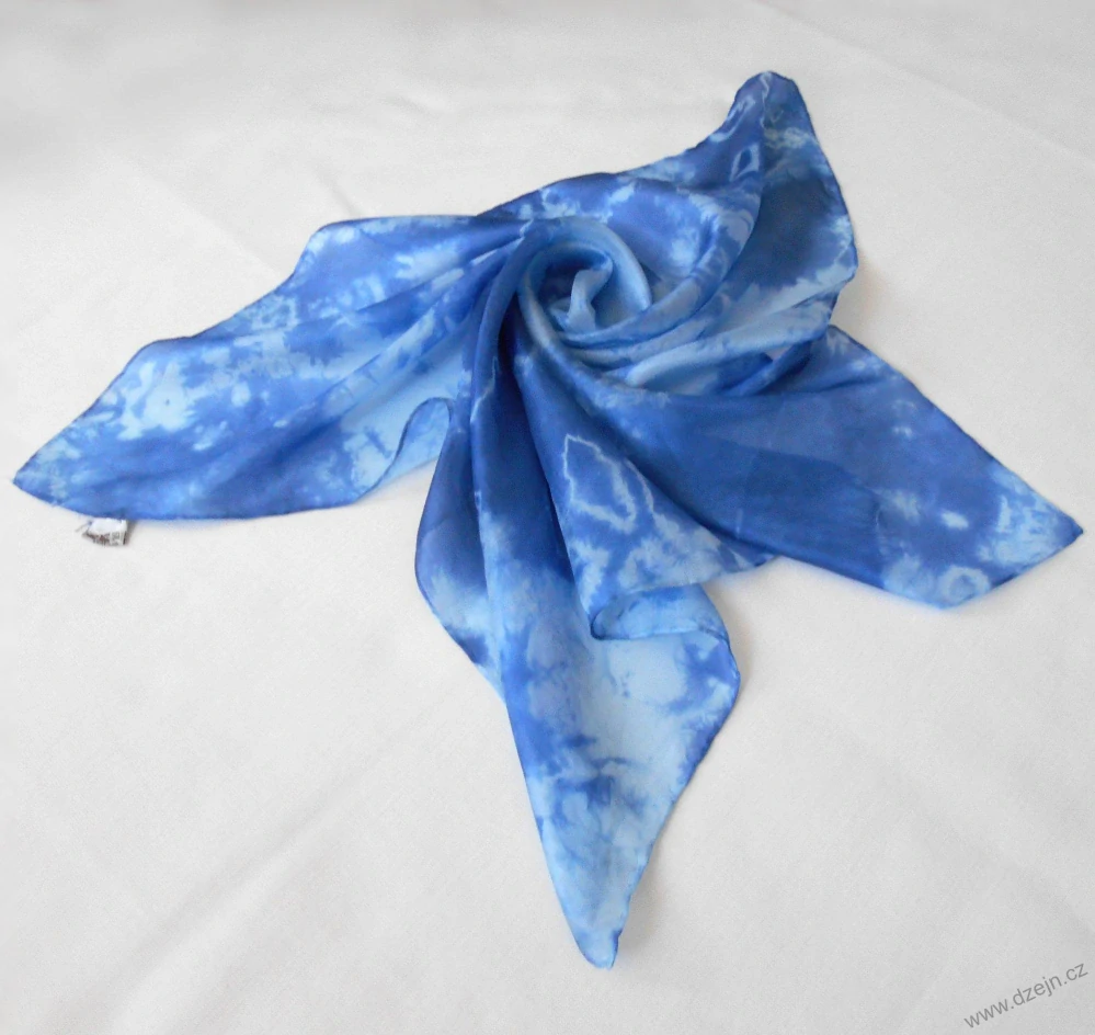 Hedvábný šátek o rozměru 55x55 cm je nabarvený světlou a tmavou modrou barvou.