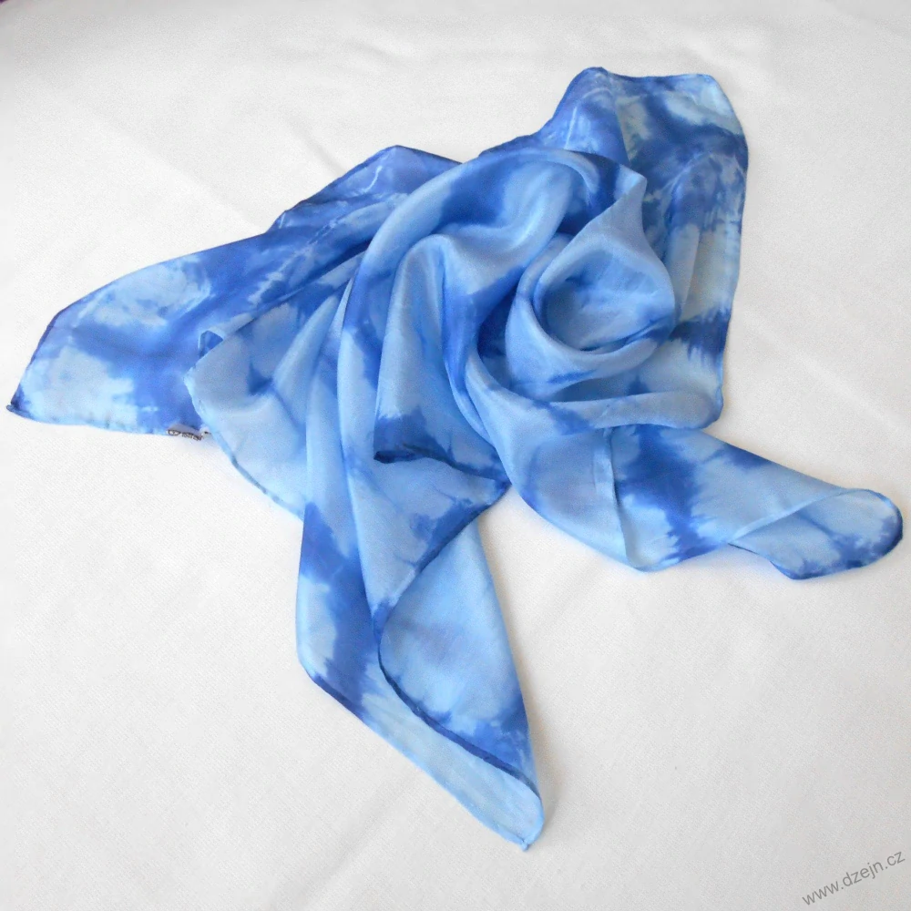 Hedvábný šátek o rozměru 55x55 cm je nabarvený světlou a tmavou modrou barvou.