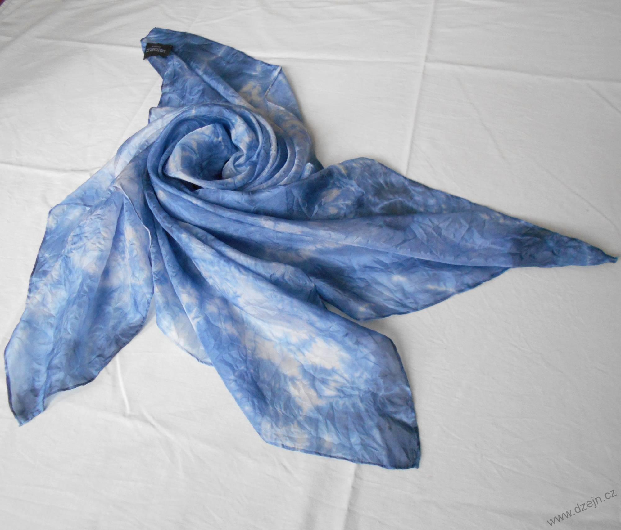 Hedvábný šátek o rozměru 90x90 cm je nabarvený modrou barvou, místy zůstal i bílý.