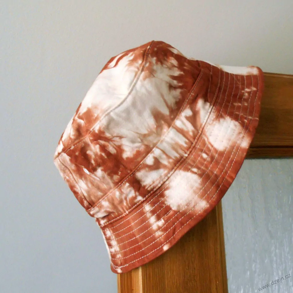Bavlněný původně bílý klobouček je batikovaný hnědou barvou, na vnitřní straně je kolem dokola proužek ze savého materiálu, po obvodu jsou čtyři větrací otvory obšité bílou nití.