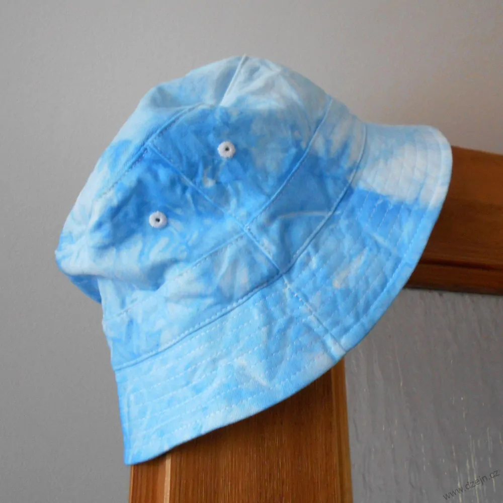 Bavlněný původně bílý klobouček je batikovaný světle modrou barvou, na vnitřní straně je kolem dokola proužek ze savého materiálu, po obvodu jsou čtyři větrací otvory obšité bílou nití.