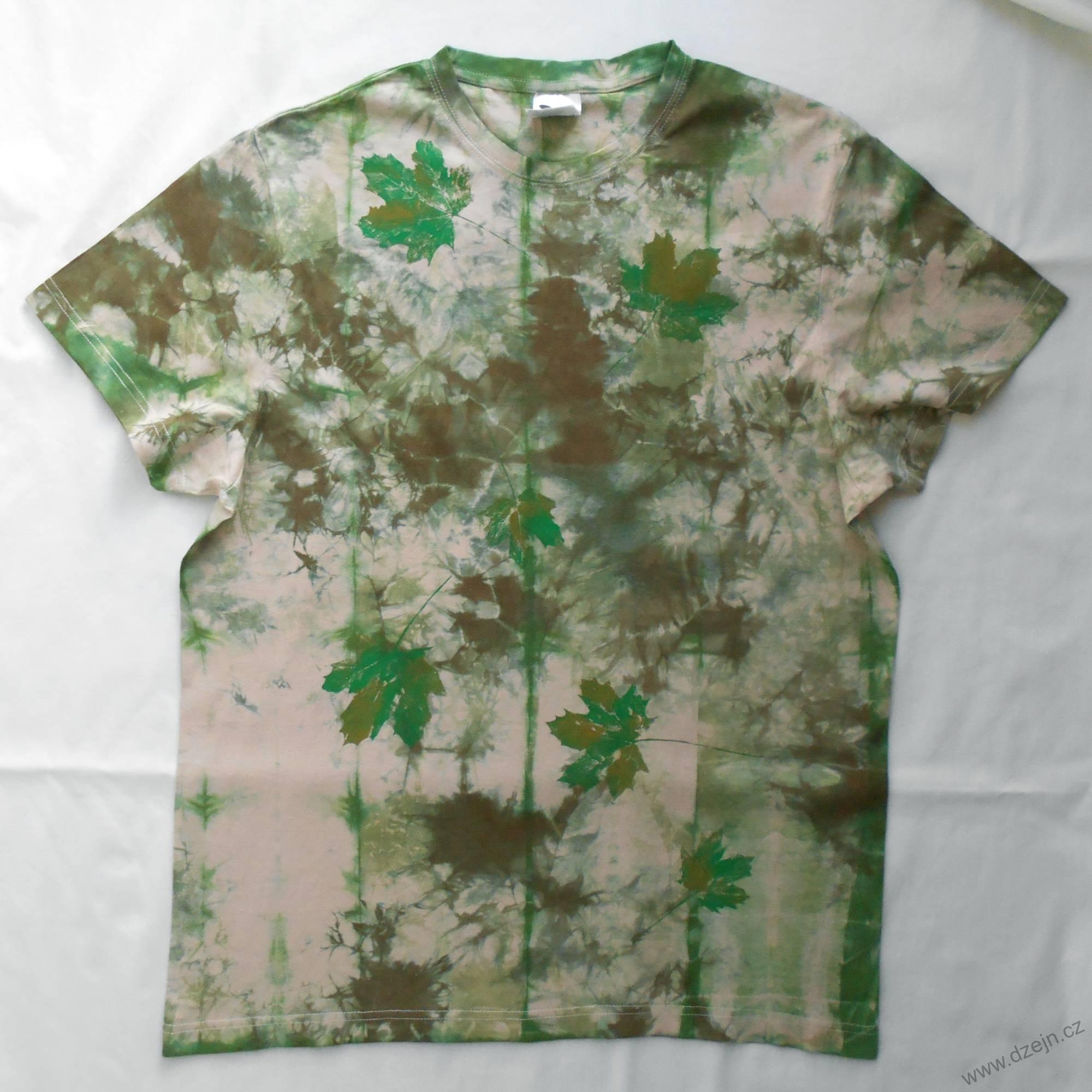 Světle béžové unisex tričko je batikované zelenou a olivovou barvou, na přední straně jsou natištěné zeleno-olivové javorové listy.