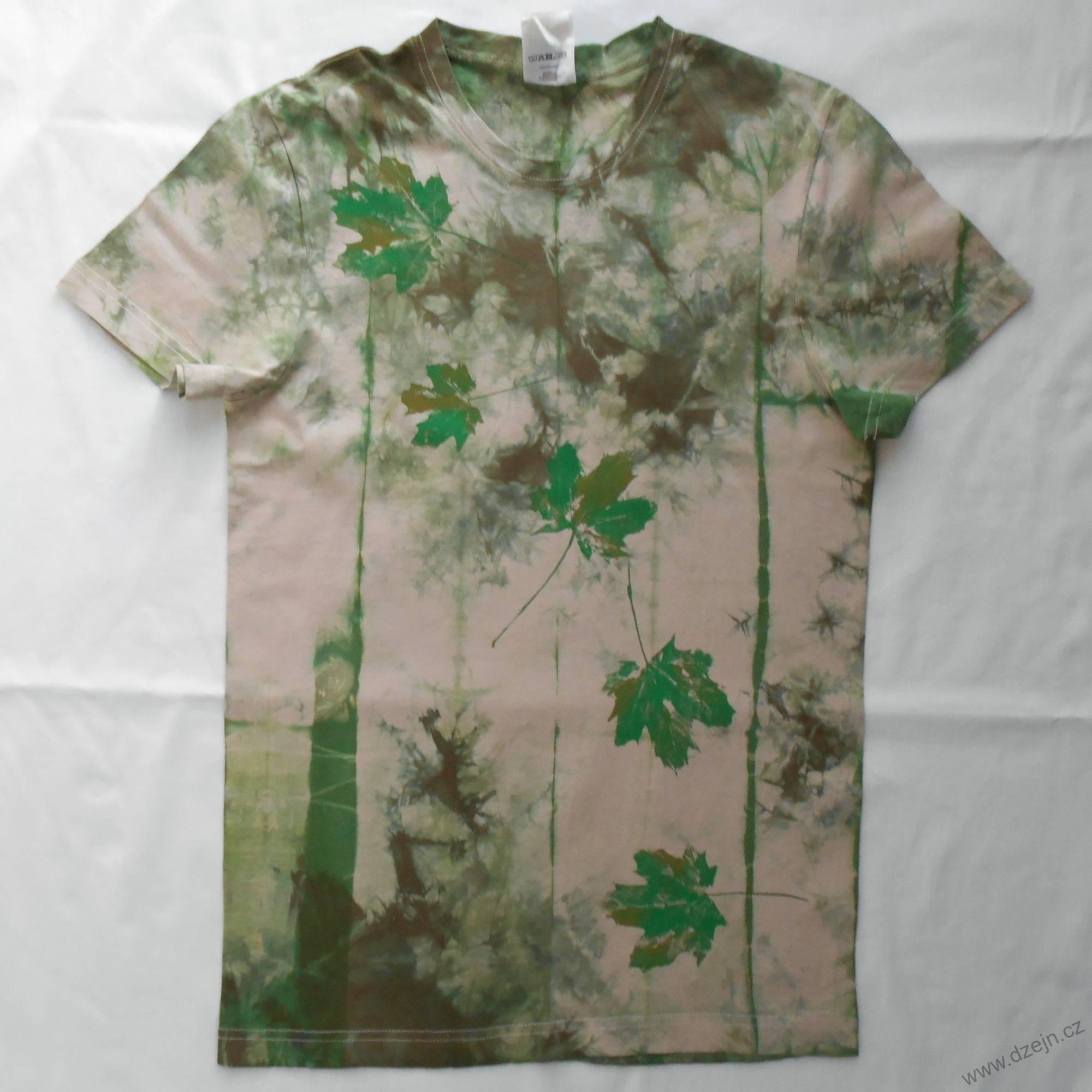 Béžové unisex tričko je batikované zelenou a olivovou barvou, na přední straně jsou natištěné zeleno-olivové javorové listy. Tričko má delší a užší střih, věnujte proto pozornost rozměrům uvedeným níže.