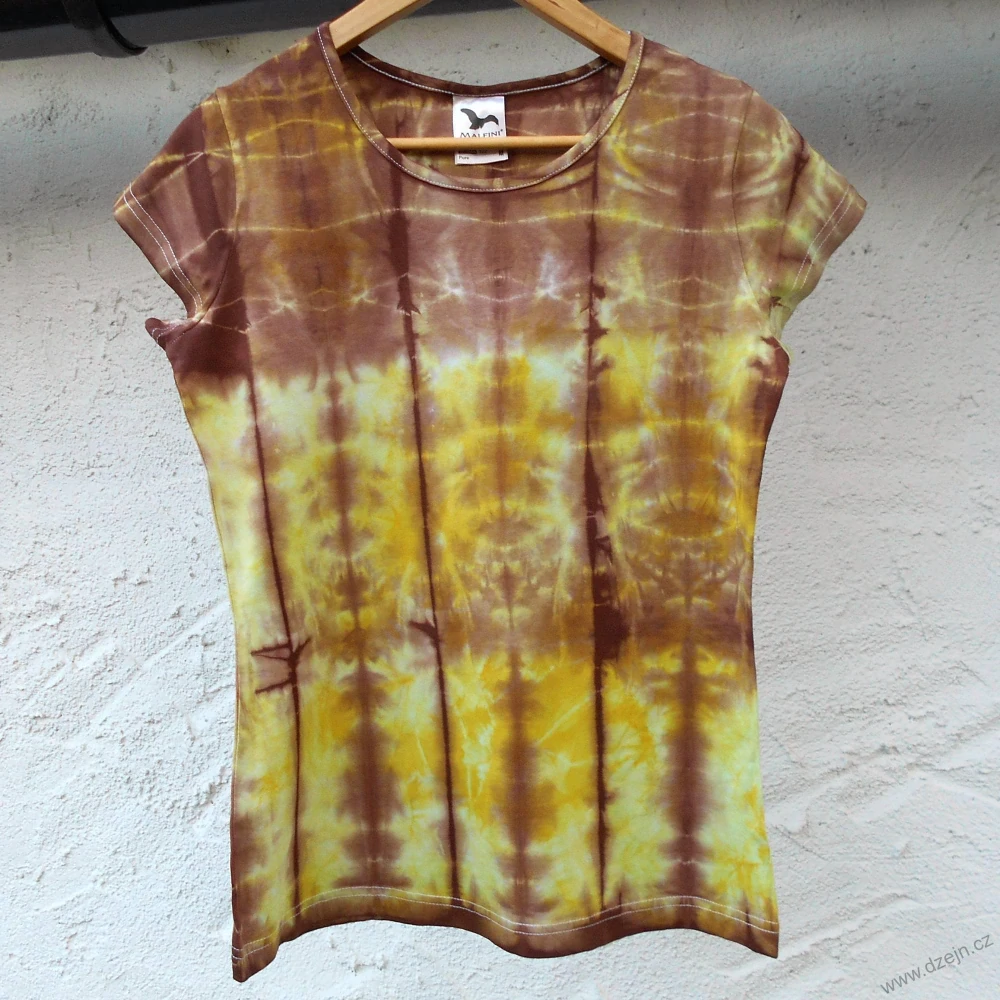 Dámské původně bílé tričko je batikované žlutozelenou a hnědou barvou. Tričko je mírně projmuté a má kulatý výstřih. Výrobce uvádí velikost M, níže najdete přesné rozměry tohoto konkrétního trička.