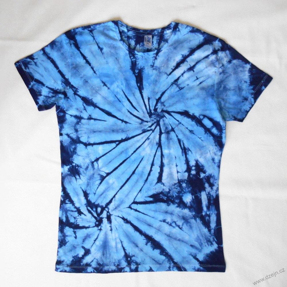 Dámské původně bílé tričko je batikované dvěma odstíny modré barvy. Tričko je mírně projmuté a má kulatý výstřih. Výrobce uvádí velikost XXL, ale je poměrně malé, níže najdete přesné rozměry tohoto konkrétního trička.