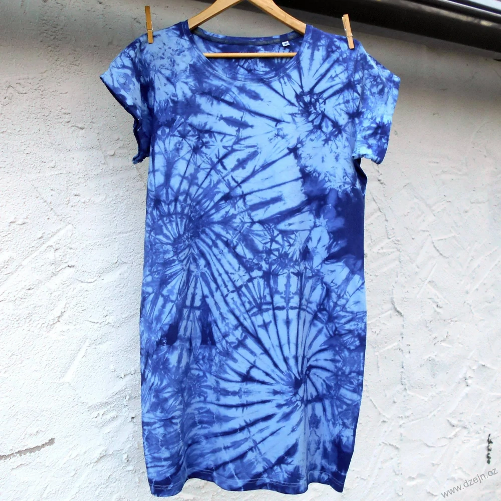 Dámské bavlněné šaty světle modré barvy jsou batikované námořní modrou barvou, batika tvoří spirály. Velikost vyberte vpravo z rozbalovacího seznamu.