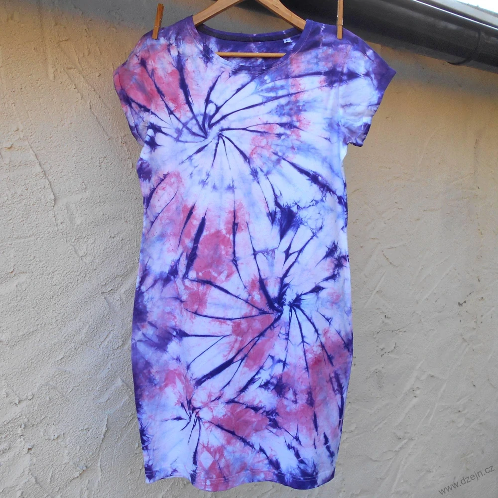 Dámské bavlněné šaty původně bílé barvy, batikované růžovou a fialovou barvou, růžová batika je strakatá, fialová tvoří spirály. Velikost vyberte vpravo z rozbalovacího seznamu.