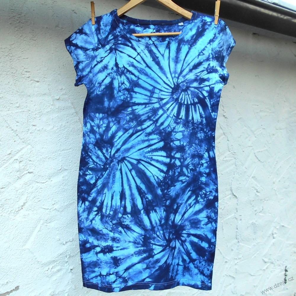Dámské bavlněné šaty původně bílé barvy, batikované dvěma odstíny modré barvy, světlejší batika je strakatá, tmavší tvoří spirály. Velikost vyberte vpravo z rozbalovacího seznamu. Fotky jsou ilustrační, pokaždé vyjde batika maličko jinak. Ale zase máte jistotu, že úplně stejné šaty nebude mít nikdo ... celý popis