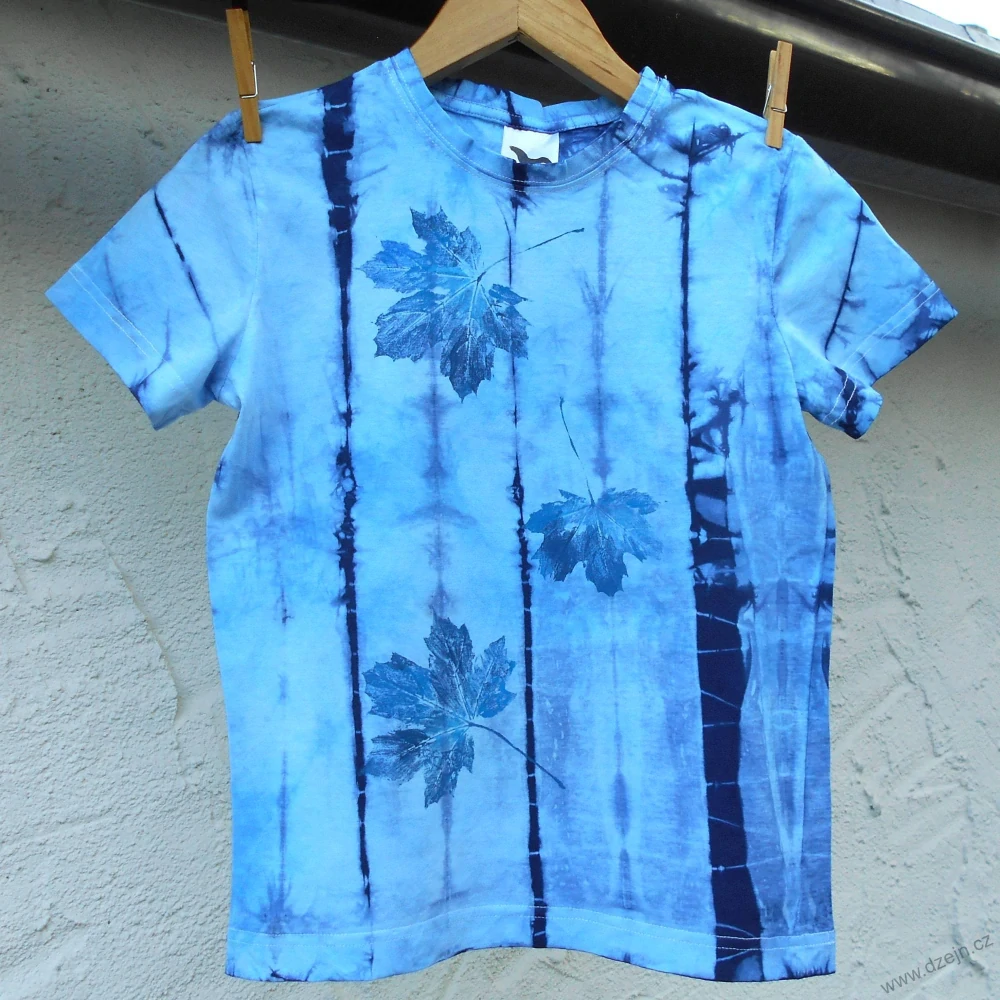 Původně bílé dětské tričko je batikované dvěma odstíny modré barvy a na přední straně jsou natisknuté javorové listy v několika odstínech modré barvy. Výrobce uvádí velikost na 8 let (134 cm), věnujte ale pozornost rozměrům uvedeným níže.
