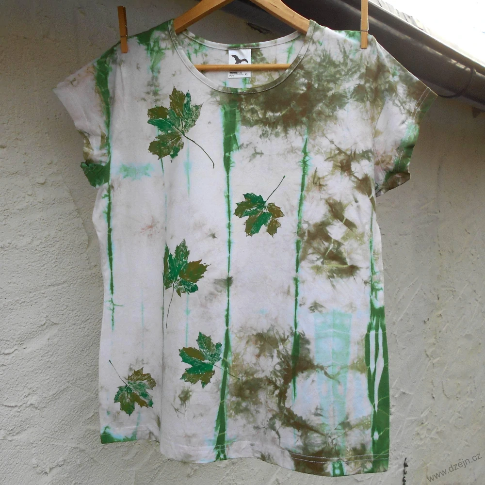 Bílé dámské tričko je batikované zelenou a olivovou barvou a na přední straně jsou natisknuté zeleno-olivové javorové listy. Tričko je mírně projmuté a má kulatý výstřih. Výrobce uvádí velikost XL, níže najdete přesné rozměry tohoto konkrétního trička.