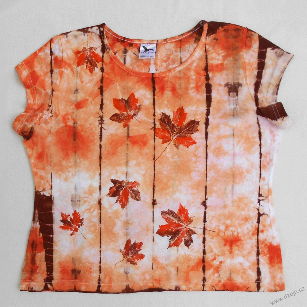 Dámské bílé triko s kulatým výstřihem je batikované oranžovou a hnědou barvou, na přední straně jsou natisknuté oranžovohnědé listy javorové listy. Výrobce uvádí velikost XXL, níže najdete přesné rozměry tohoto konkrétního trička.