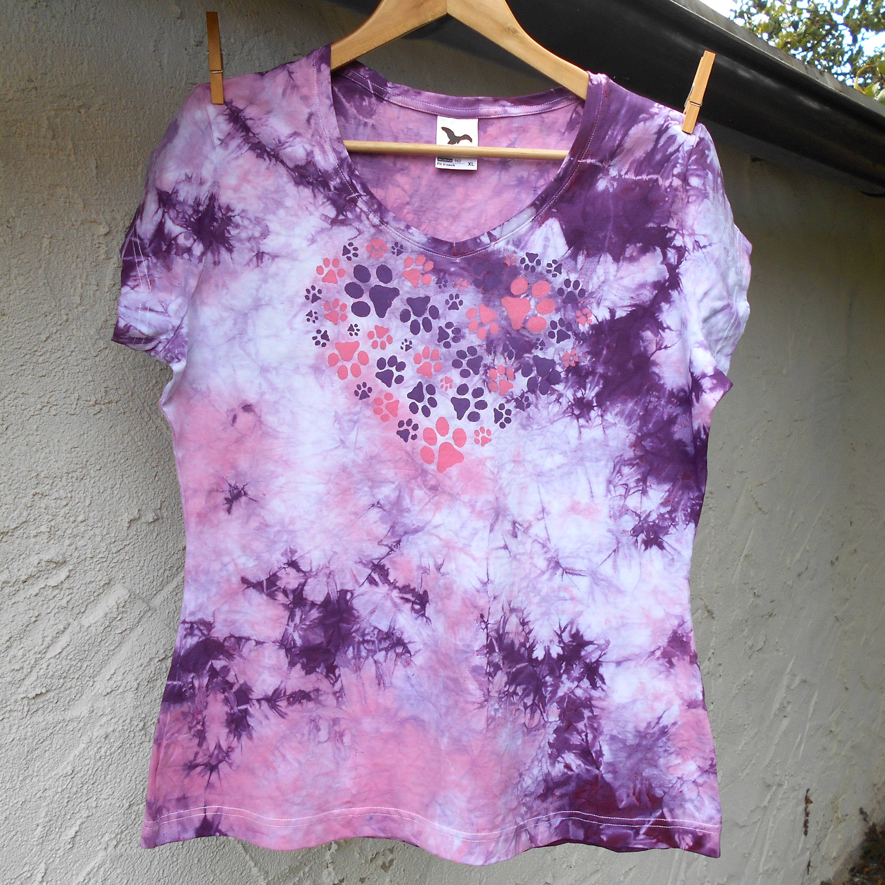 Dámské bílé tričko je batikované růžovou a fialovou barvou a na přední straně jsou natisknuté růžové a fialové kočičí (nebo možná psí?) stopy do tvaru srdce. Tričko je mírně projmuté a má kulatý výstřih. Výrobce uvádí velikost XL, níže najdete přesné rozměry tohoto konkrétního trička.