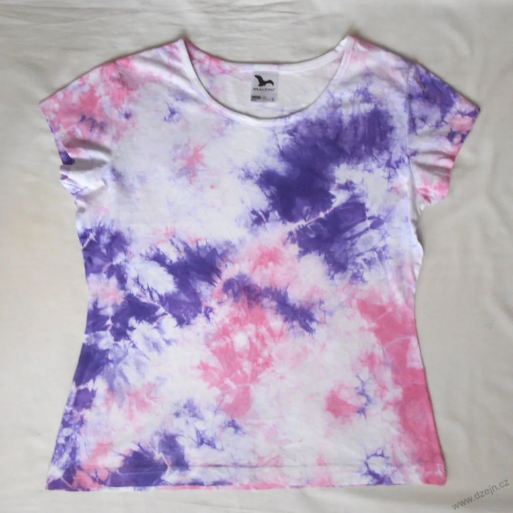 Dámské původně bílé tričko je batikované růžovou a fialovou barvou. Tričko je mírně projmuté a má kulatý výstřih. Výrobce uvádí velikost L, níže najdete přesné rozměry tohoto konkrétního trička.