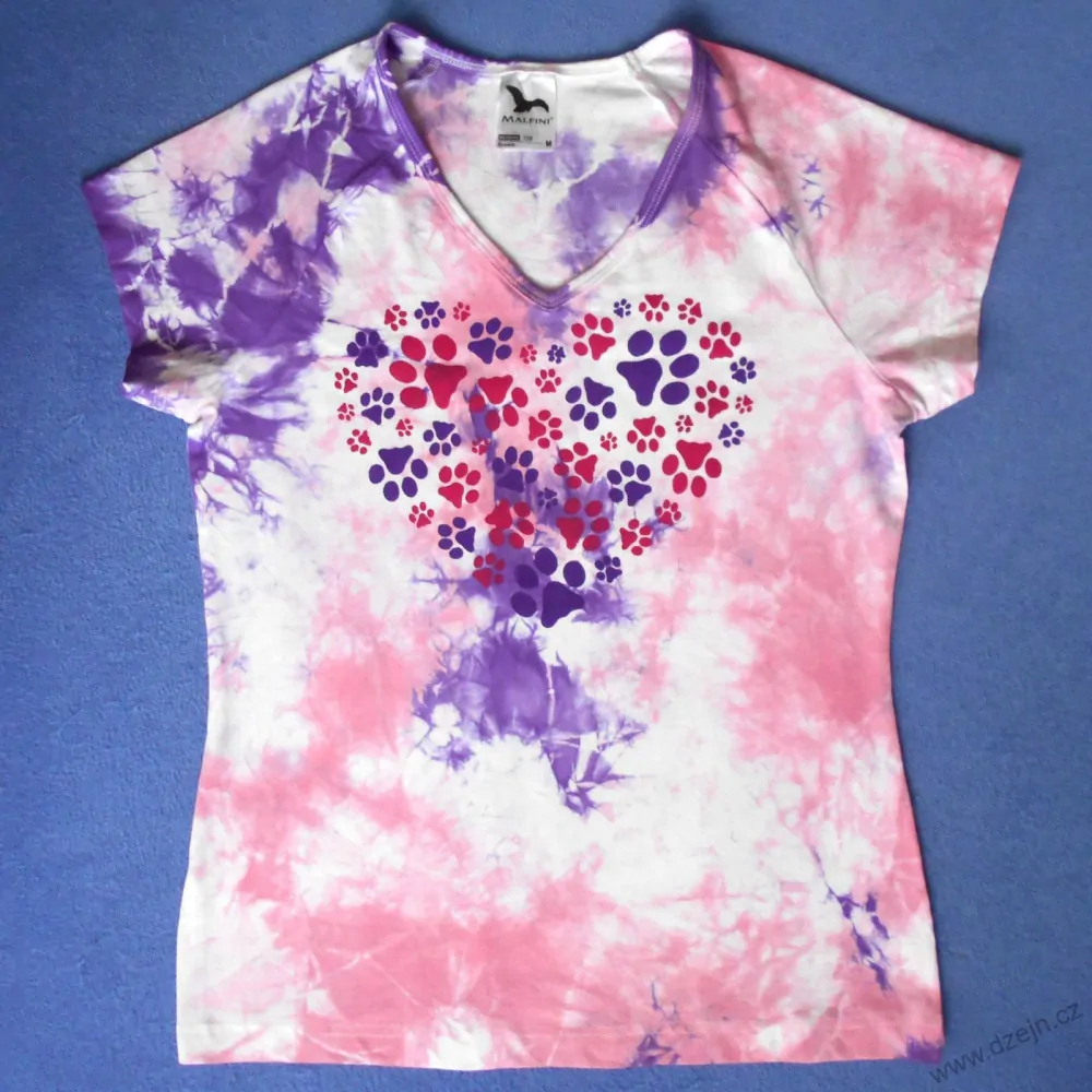 Dámské bílé tričko je batikované růžovou a fialovou a na přední straně jsou natisknuté tmavě růžové a fialové kočičí (nebo možná psí?) stopy do tvaru srdce. Tričko je mírně projmuté a má výstřih do V. Výrobce uvádí velikost M, níže najdete přesné rozměry tohoto konkrétního trička.