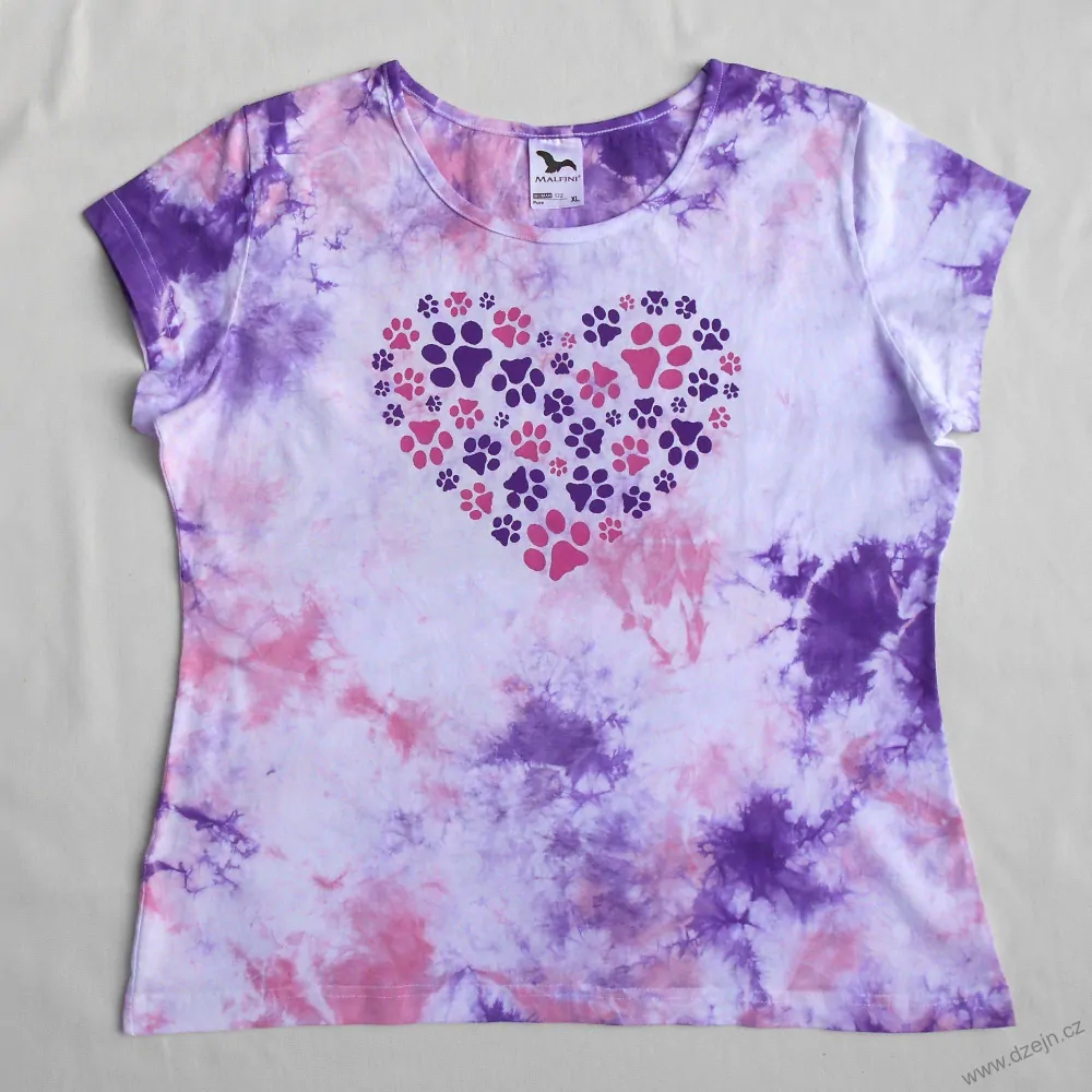 Dámské bílé tričko je batikované růžovou a fialovou a na přední straně jsou natisknuté růžové a fialové kočičí (nebo možná psí?) stopy do tvaru srdce. Tričko je mírně projmuté a má kulatý výstřih. Výrobce uvádí velikost XL, níže najdete přesné rozměry tohoto konkrétního trička.