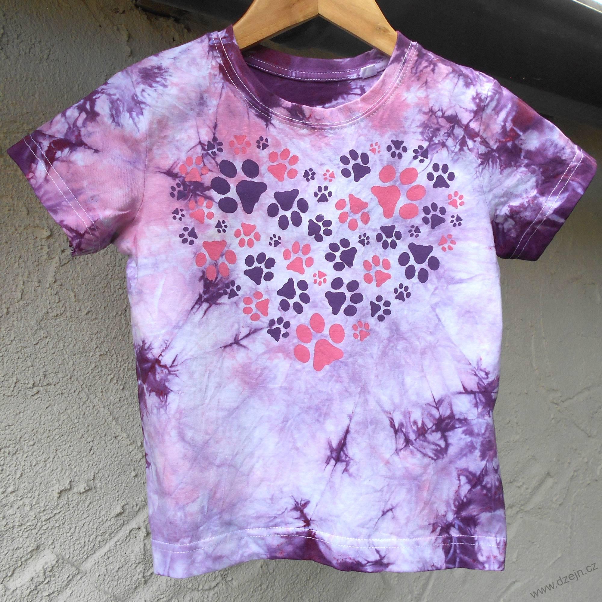 Bílé dětské tričko je batikované růžovou a fialovou barvou a na přední straně jsou natištěné růžové a fialové kočičí (nebo možná psí?) stopy do tvaru srdce. Výrobce uvádí velikost na 6 let, věnujte ale pozornost rozměrům uvedeným níže.