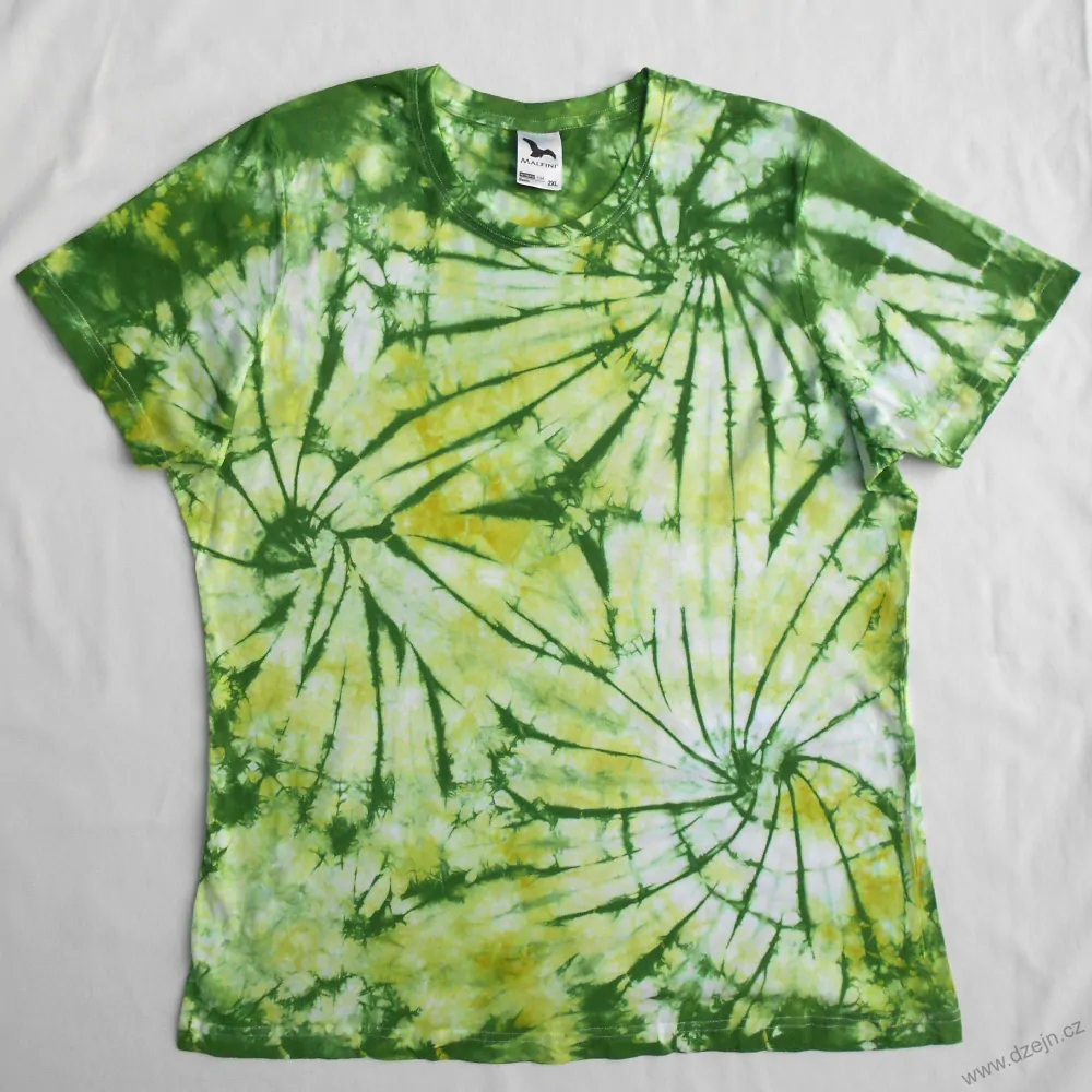 Dámské původně bílé tričko je batikované žlutozelenou a tmavší zelenou barvou. Tričko je mírně projmuté a má kulatý výstřih. Výrobce uvádí velikost XXL, níže najdete přesné rozměry tohoto konkrétního trička.