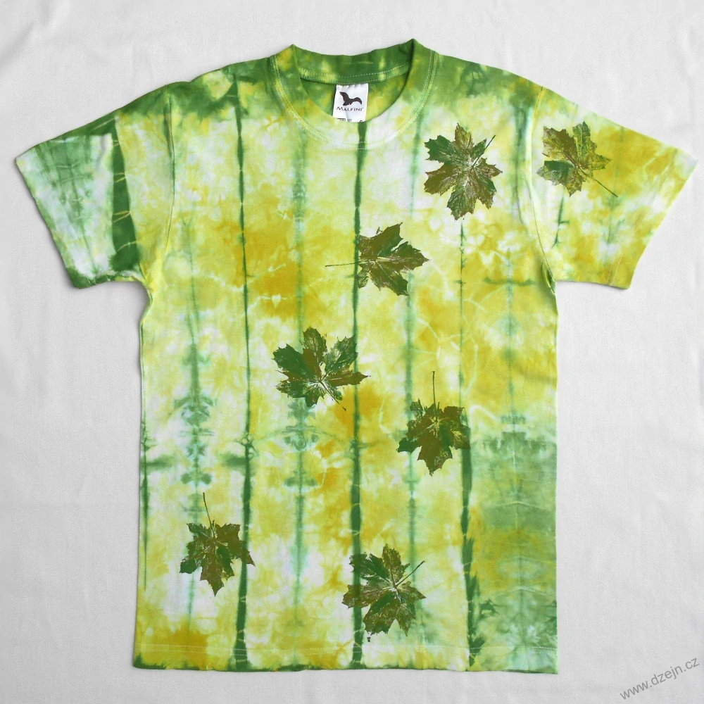 Bílé unisex tričko je batikované žlutozelenou a tmavší zelenou barvou, na přední straně jsou natiskuté zelené javorové listy. Výrobce uvádí velikost S, níže najdete přesné rozměry tohoto konkrétního trička.