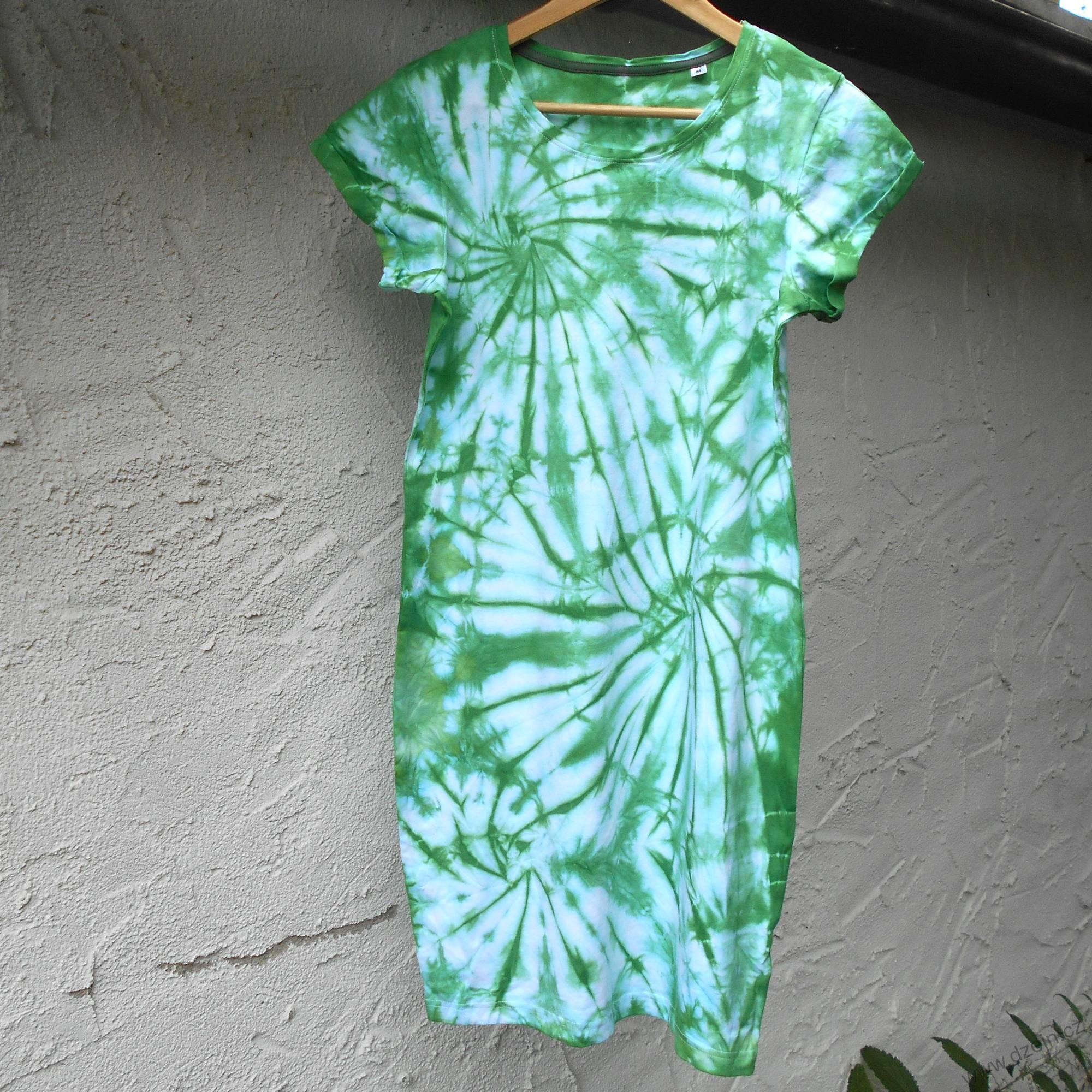 Dámské bavlněné šaty původně bílé barvy, batikované zelenou barvou, batika tvoří spirály.