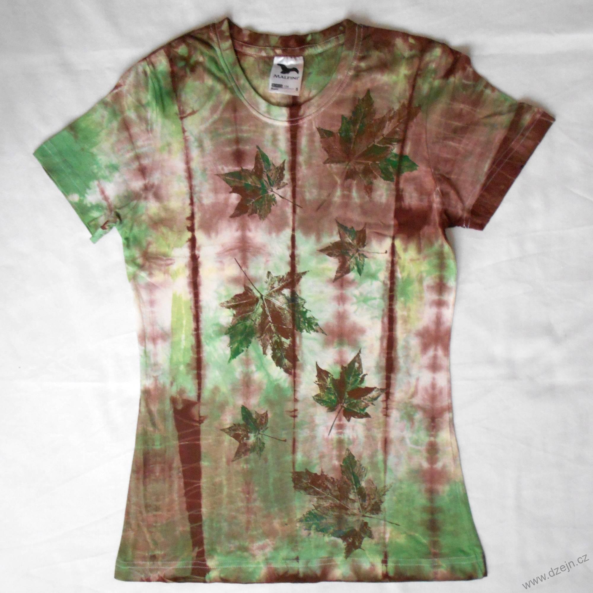 Bílé dámské tričko je batikované zelenou a hnědou barvou a na přední straně jsou natisknuté zeleno-hnědé javorové listy. Tričko je mírně projmuté a má kulatý výstřih. Výrobce uvádí velikost S, níže najdete přesné rozměry tohoto konkrétního trička.