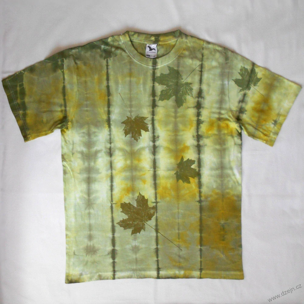 Bílé unisex tričko je batikované žlutozelenou a olivově zelenou barvou, na přední straně jsou natiskuté khaki javorové listy. Výrobce uvádí velikost XXL, níže najdete přesné rozměry tohoto konkrétního trička.