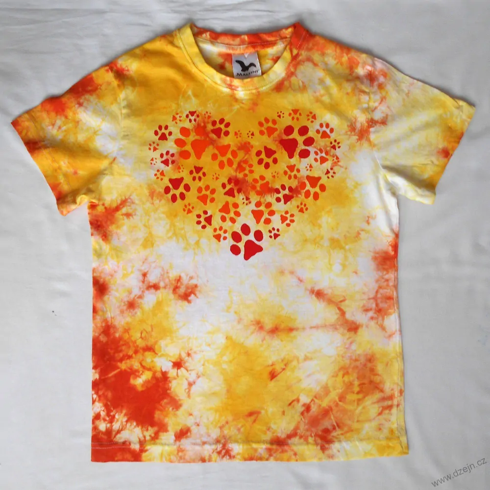 Bílé dětské tričko je batikované žlutou a oranžovou barvou a na přední straně jsou natištěné žluté a červené kočičí (nebo možná psí?) stopy do tvaru srdce. Výrobce uvádí velikost na 12 let, věnujte ale pozornost rozměrům uvedeným níže.