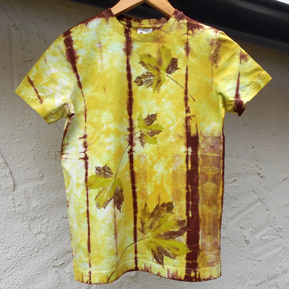 Původně bílé dětské tričko je batikované žlutozelenou a hnědou barvou a na přední straně jsou natisknuté žlutozeleno-hnědé javorové listy. Výrobce uvádí velikost na 10 let (146 cm), ale věnujte prosím pozornost rozměrům uvedeným níže.