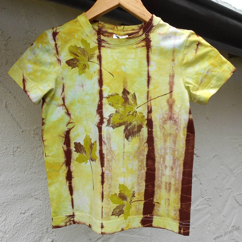 Původně bílé dětské tričko je batikované žlutozelenou a hnědou barvou a na přední straně jsou natisknuté žlutozeleno-hnědé javorové listy. Výrobce uvádí velikost na 6 let (122 cm), ale věnujte prosím pozornost rozměrům uvedeným níže.