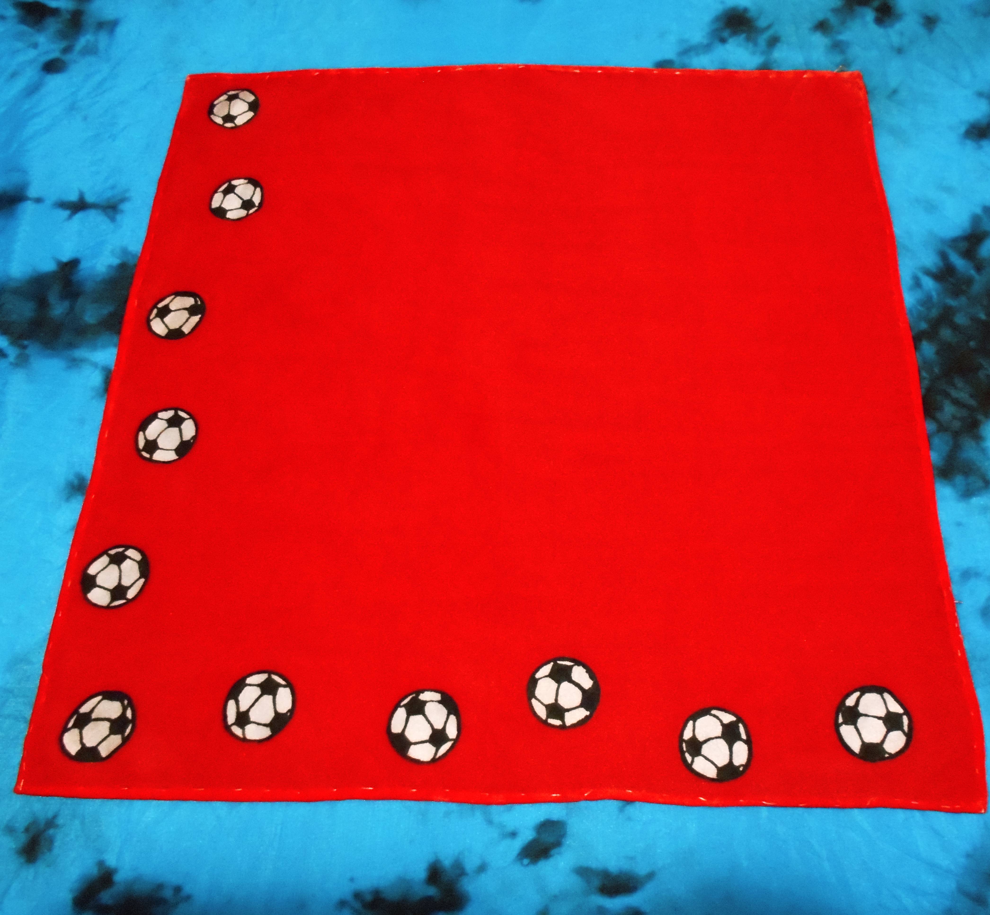 Hedvábný kapesníček o rozměru 28x28 cm je nabarvený červenou barvou, podél dvou stran jsou namalované fotbalové míče černou konturou.