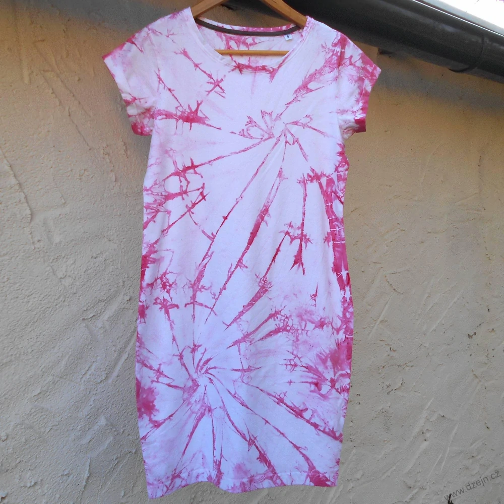 Původně bílé dámské šaty jsou batikované růžovou barvou. Velikost vyberte z rozbalovacího seznamu vpravo, rozměry jednotlivých velikostí jsou uvedeny níže.