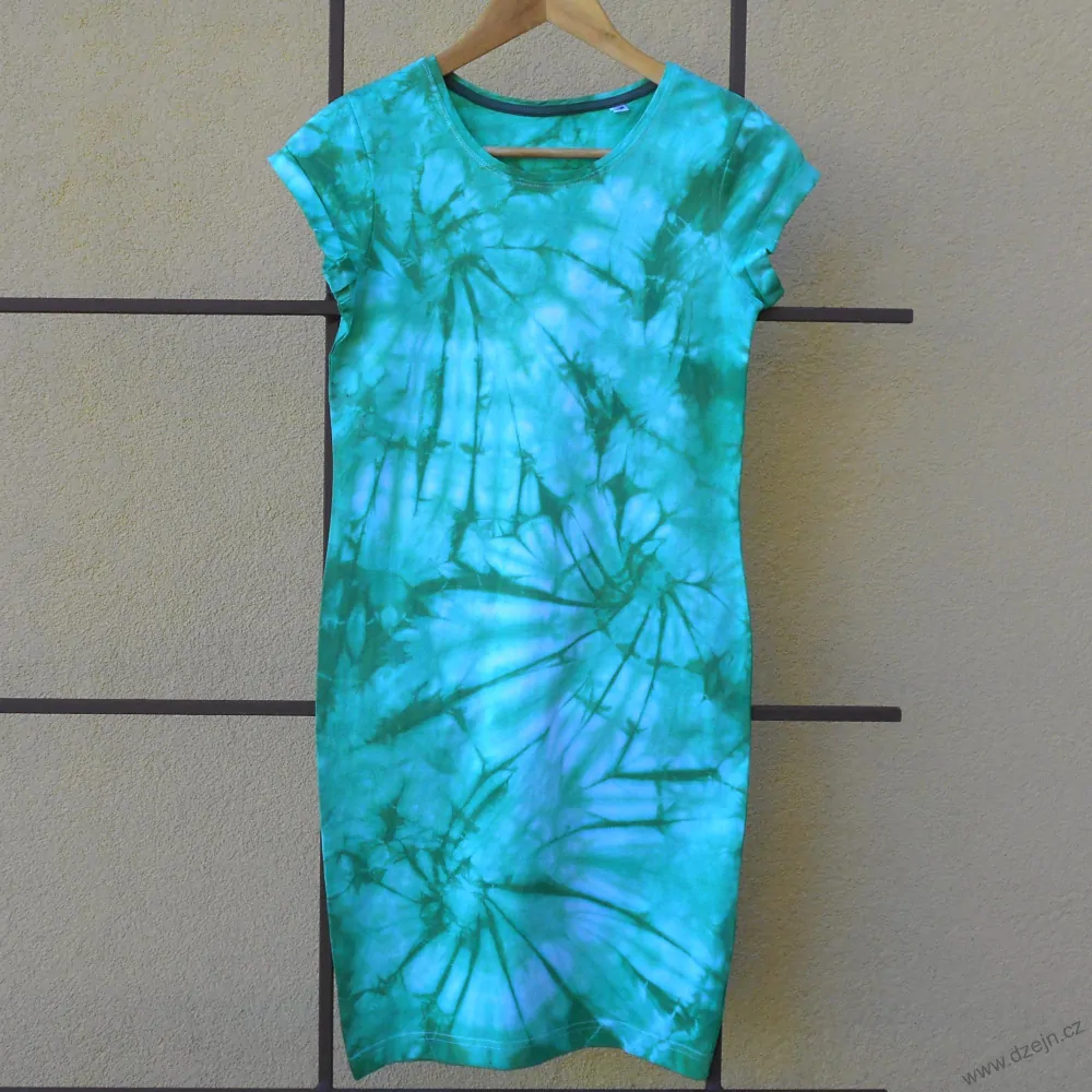 Původně bílé dámské šaty jsou batikované zelenou barvou, místy je světlejší odstín zelené trochu do modra nebo tyrkysova. Výrobce uvádí velikost XS, věnujte ale pozornost rozměrům uvedeným níže.