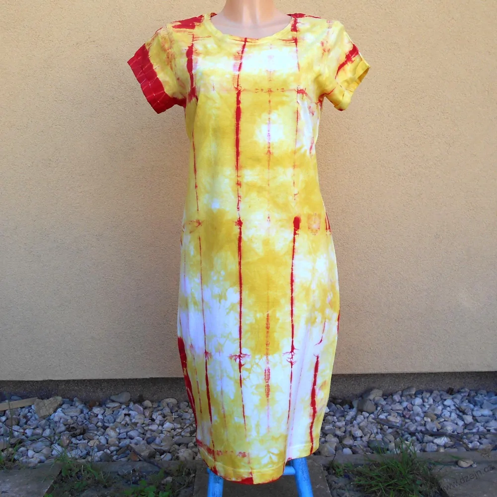 Původně bílé dámské šaty jsou batikované žlutou a červenou barvou. Výrobce uvádí velikost M, věnujte ale pozornost rozměrům uvedeným níže.