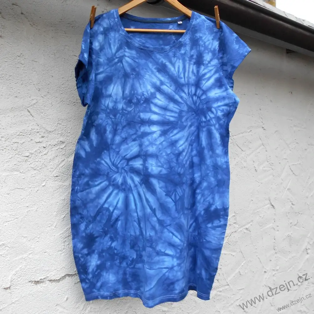Dámské bavlněné šaty původně bílé barvy, batikované dvěma odstíny modré barvy, velikost XL, níže najdete rozměry. K dispozici jsou tři podobné kusy.