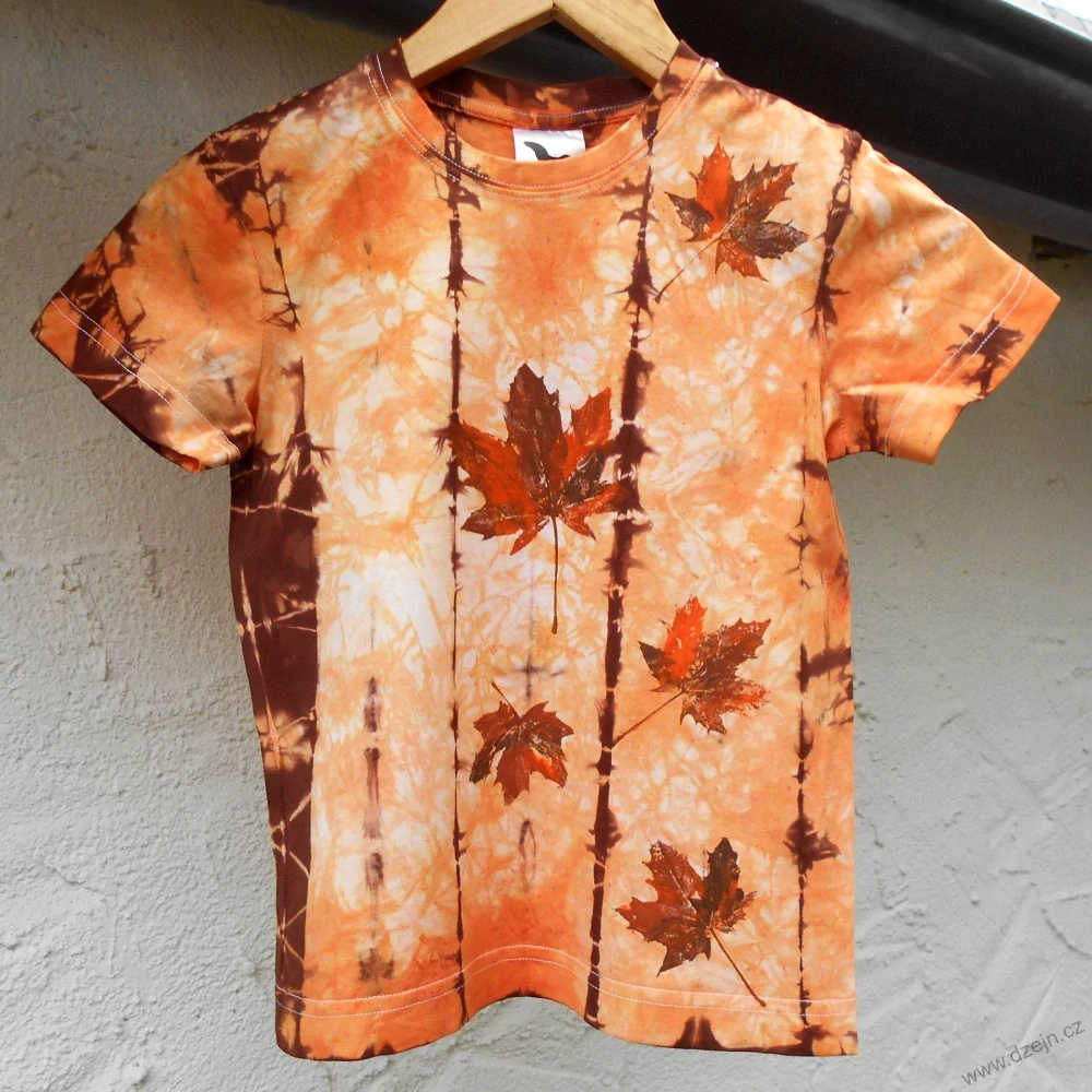 Bílé dětské tričko je batikované oranžovou a hnědou barvou a na přední straně jsou natisknuté oranžovohnědé javorové listy. Výrobce uvádí velikost na 6 let (122 cm), ale věnujte pozornost rozměrům uvedeným níže.