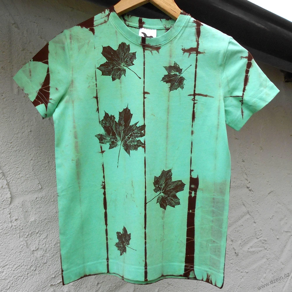 Světle zelené dětské tričko je batikované hnědou barvou a na přední straně jsou natisknuté hnědé javorové listy. Výrobce uvádí velikost na 8 let, ale věnujte prosím pozornost rozměrům uvedeným níže.