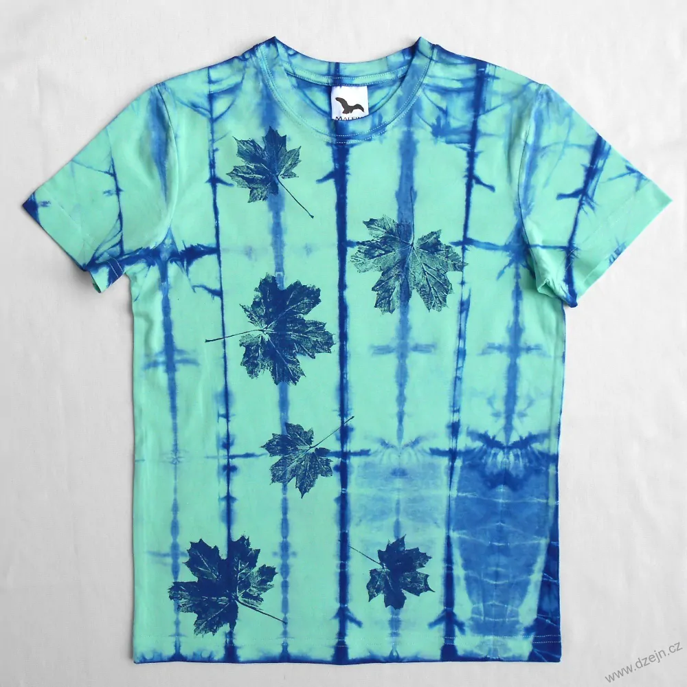Světle zelené dětské tričko je batikované modrou barvou a na přední straně jsou natisknuté modré javorové listy. Výrobce uvádí velikost na 10 let, ale věnujte prosím pozornost rozměrům uvedeným níže.