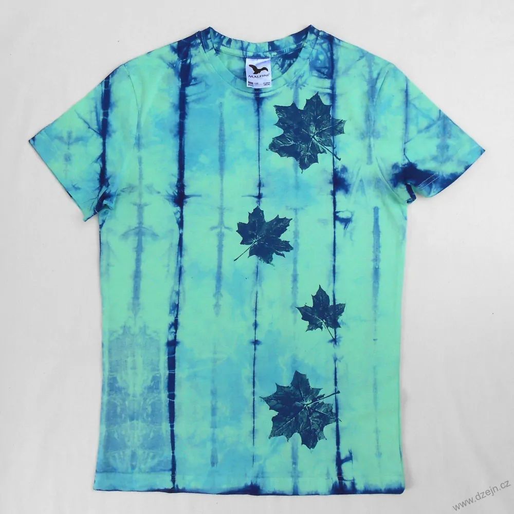 Světle zelené dětské tričko je batikované modrou barvou a na přední straně jsou natisknuté modré javorové listy. Výrobce uvádí velikost na 12 let, ale věnujte prosím pozornost rozměrům uvedeným níže.