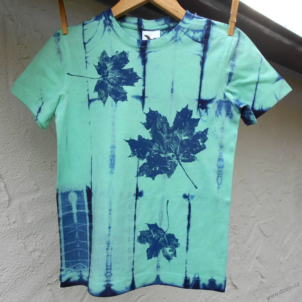 Světle zelené dětské tričko je batikované tmavě modrou a na přední straně jsou natisknuté tmavomodré javorové listy. Výrobce uvádí velikost na 8 let, ale věnujte prosím pozornost rozměrům uvedeným níže.