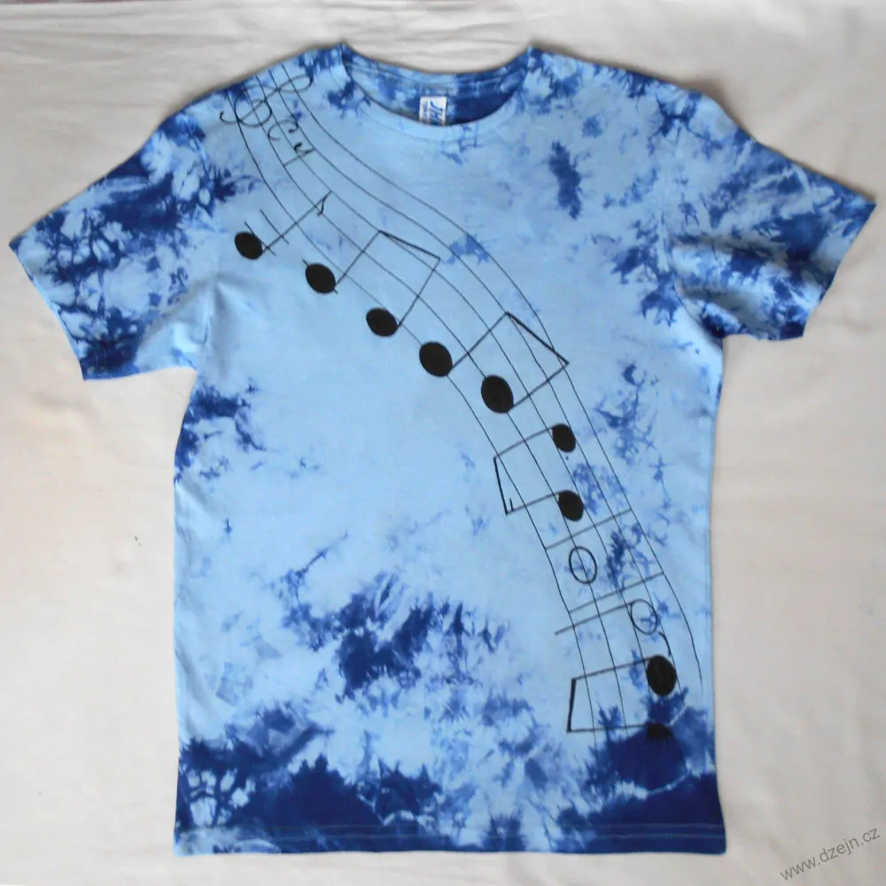 Dětské světle modré tričko je batikované tmavě modrou barvou, na přední straně je domalovaná notová osnova černou konturou. Výrobce uvádí velikost na 12-14 let, věnujte ale pozornost rozměrům uvedeným níže.