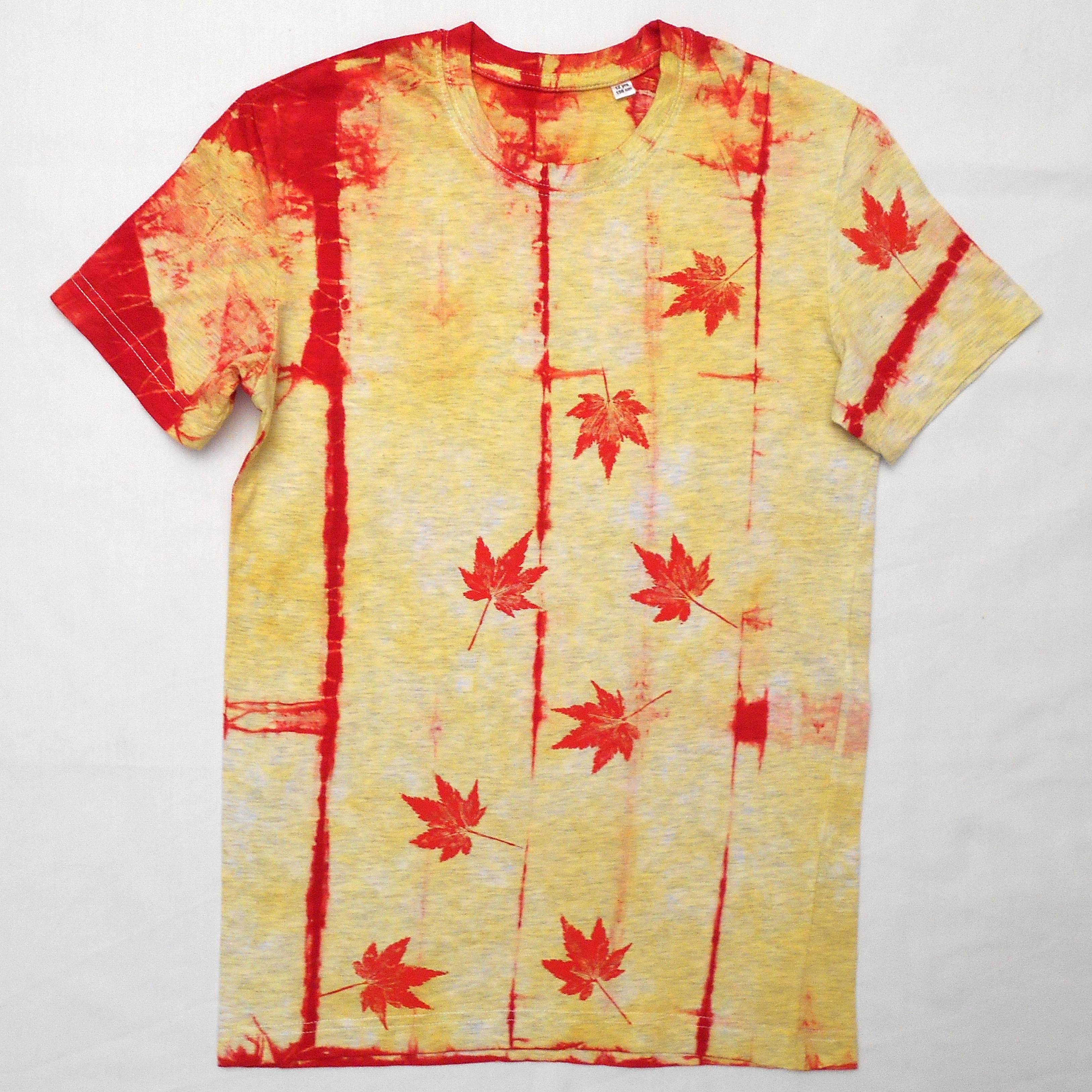 Dětské tričko barvy šedý melír je batikované žlutou a červenou barvou, na přední straně jsou natisknuté červené listy ozdobného japonského javoru. Výrobce uvádí velikost na 158 (na 12 let, ale věnujte prosím pozornost rozměrům uvedeným níže.