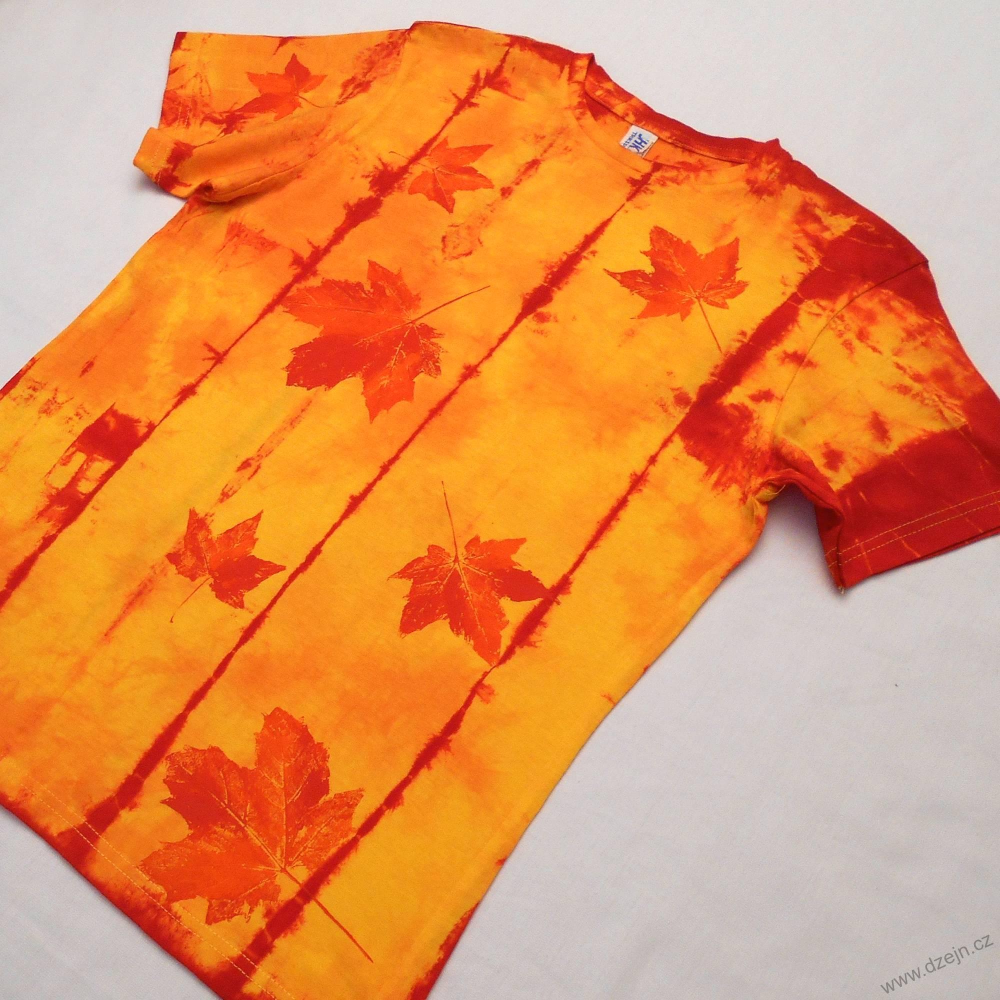 Tmavší žluté dětské tričko je batikované oranžovou a červenou barvou, na přední straně jsou natisknuté oranžovočervené javorové listy. Výrobce uvádí velikost na 12-14 let, ale věnujte prosím pozornost rozměrům uvedeným níže.