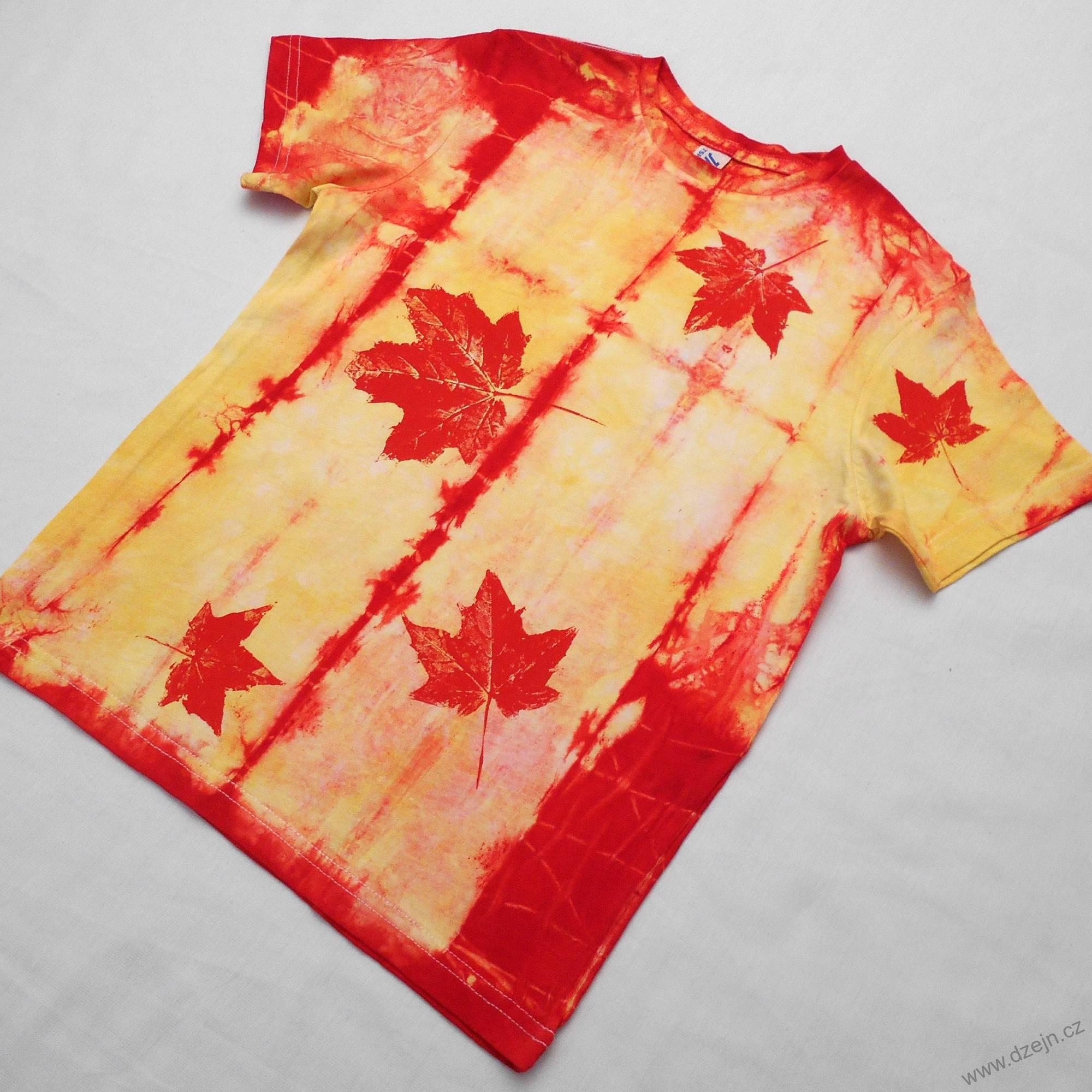 Původně bílé dětské tričko je batikované žlutou a červenou barvou, na přední straně jsou natisknuté červené javorové listy. Výrobce uvádí velikost na 7-8 let, ale věnujte prosím pozornost rozměrům uvedeným níže.
