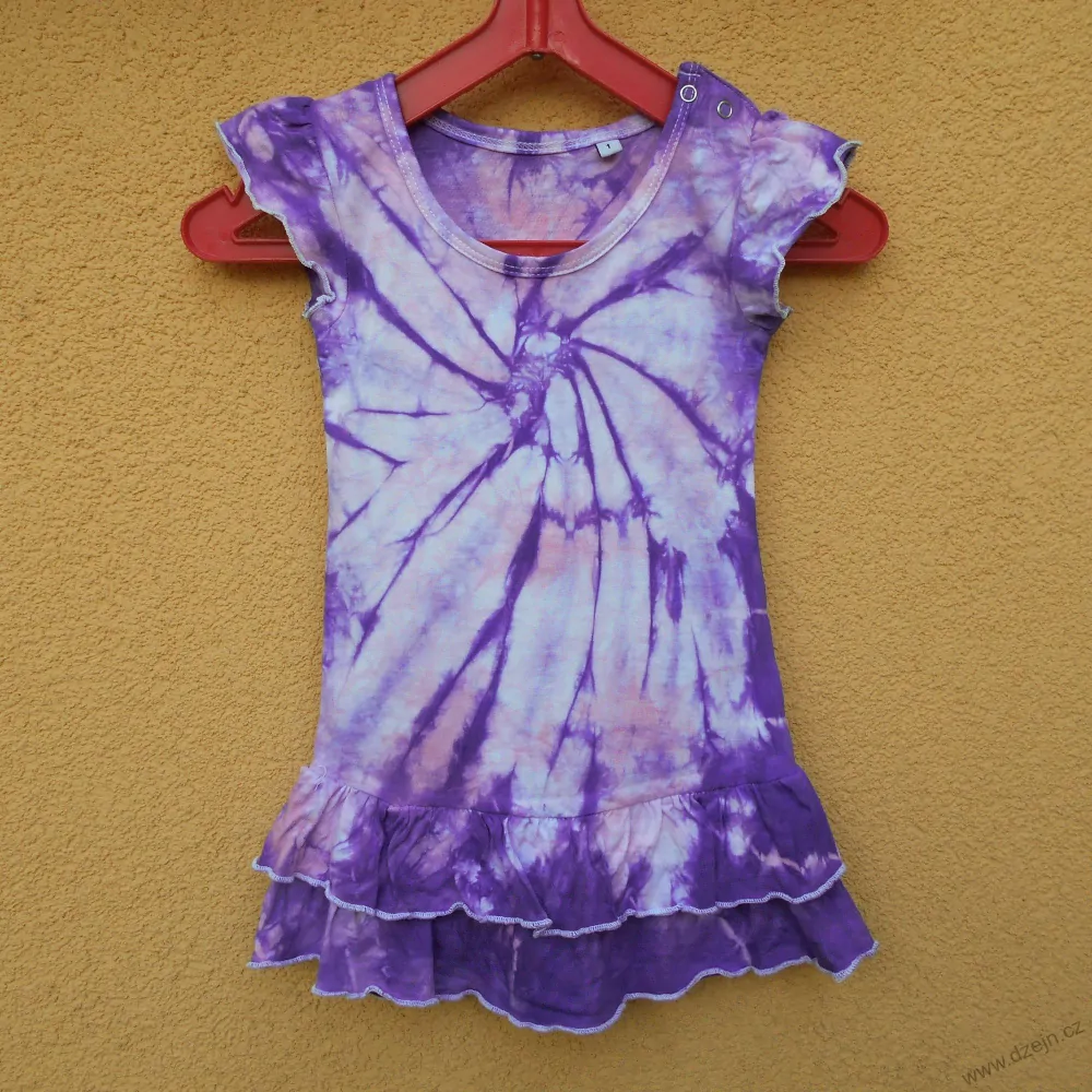 Původně bílé dívčí šaty jsou batikované růžovou a fialovou barvou, fialová batika tvoří spirály, které jsou na každé straně šatů trošku jiné. Výrobce uvádí velikost 1 rok, ale zdají se mi menší, věnujte proto pozornost rozměrům uvedeným níže. Na jednom rameni mají zapínání na dvě patentky