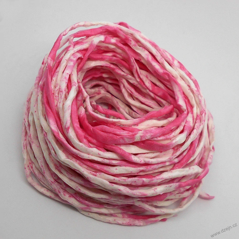 Hedvábná šňůrka z pravého přírodního hedvábí pongé 5 je ručně barvená růžovou barvou, místy je ponechána bílá. Délka šňůrky je 105-110 cm, průměr cca 2 mm. Šňůrka je plochá a lze ji protáhnou i dírkou o průměru 1 mm.