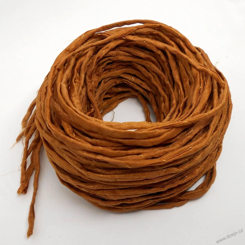Hedvábná šňůrka z pravého přírodního hedvábí pongé 5 je ručně barvená světlejší hnědou barvou (trochu světlejší než sienna). Délka šňůrky je 105-110 cm, průměr cca 2 mm. Šňůrka je plochá a lze ji protáhnou i dírkou o průměru 1 mm.