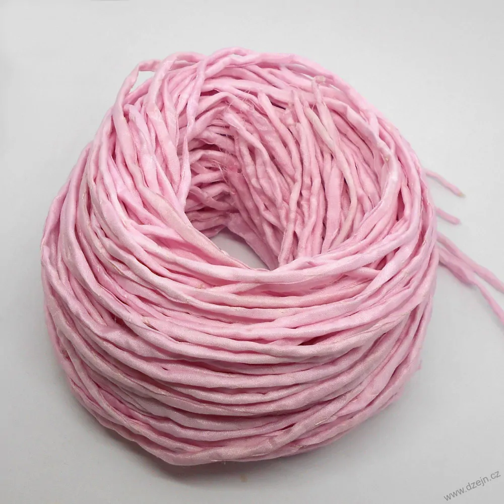 Hedvábná šňůrka z pravého přírodního hedvábí pongé 5 je ručně barvená světle růžovou barvou. Délka šňůrky je 105-110 cm, průměr cca 2 mm. Šňůrka je plochá a lze ji protáhnou i dírkou o průměru 1 mm.