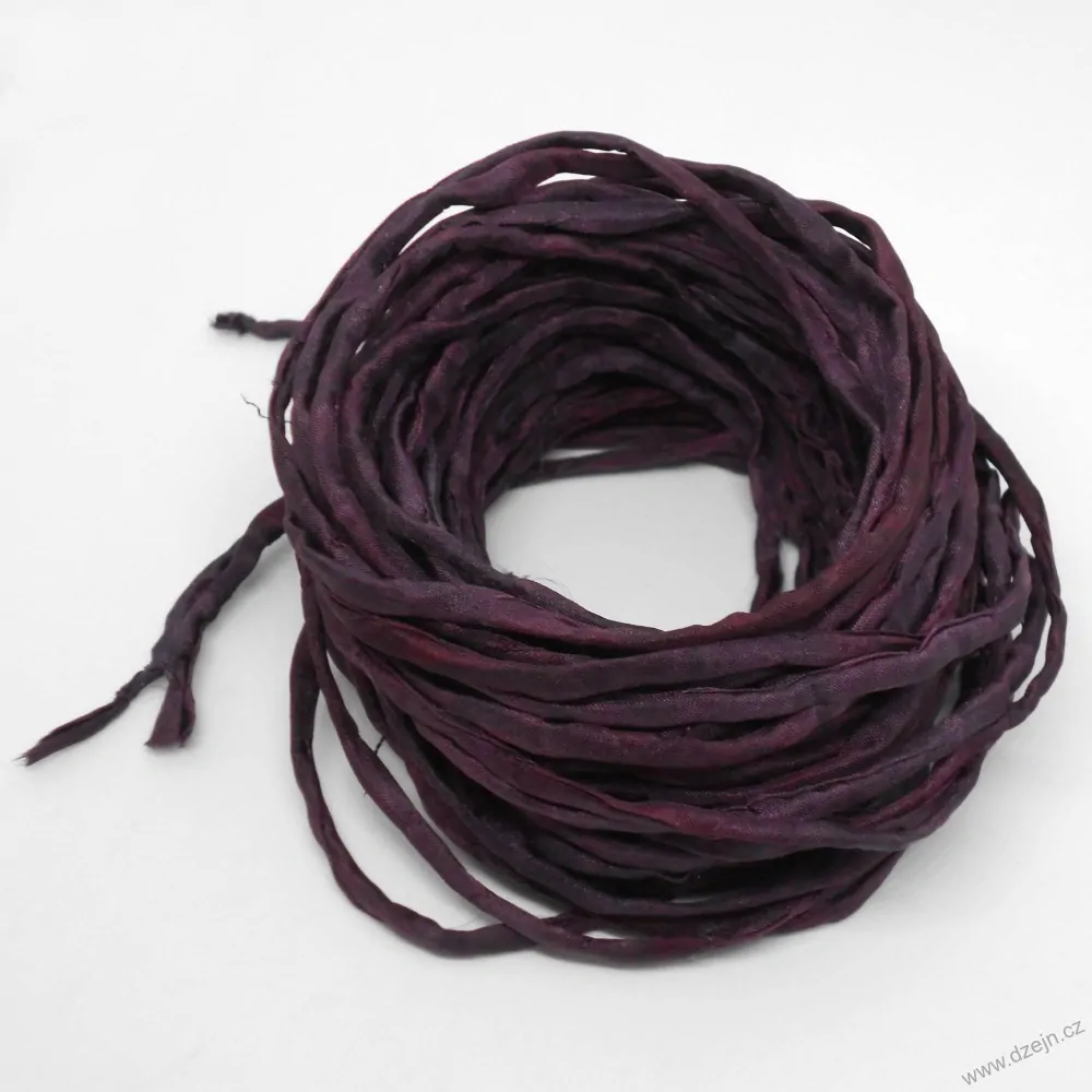 Hedvábná šňůrka z pravého přírodního hedvábí pongé 5 je ručně barvená hodně tmavou hnědofialovou barvou (barva není úplně jednolitá). Délka šňůrky je 105-110 cm, průměr cca 2 mm. Šňůrka je plochá a lze ji protáhnou i dírkou o průměru 1 mm.