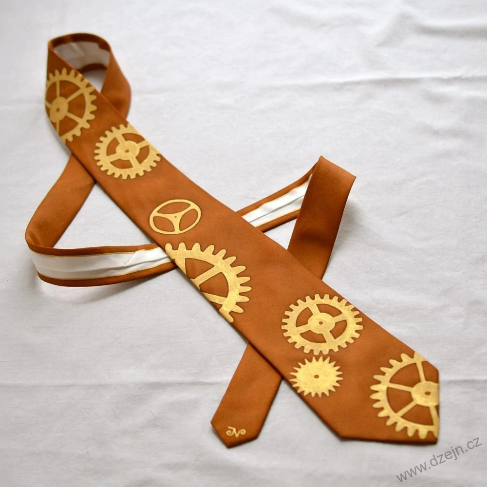 Ručně malovaná hedvábná kravata klasické velikosti 9,5 x 140 cm, světle hnědý podklad, zlatá ozubená kolečka, zadní strana bílá, 100% přírodní hedvábí Habotai 10.